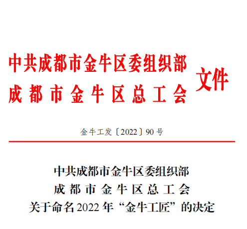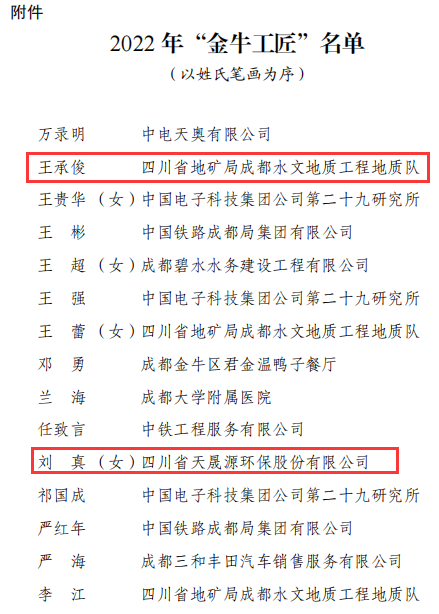 2022122日,中共成都市金牛區(qū)委組織部成都市金牛區(qū)總工會(huì)發(fā)布《關(guān)于命名2022年“金牛工匠”的決定》,四川省天晟源環(huán)保股份有限公司(簡(jiǎn)稱“天晟源環(huán)?!保┩醭锌?、劉真、童賢清三人獲得“金牛工匠”認(rèn)定。至此,天晟源環(huán)保已有5人獲得“金牛工匠”稱號(hào)認(rèn)定。