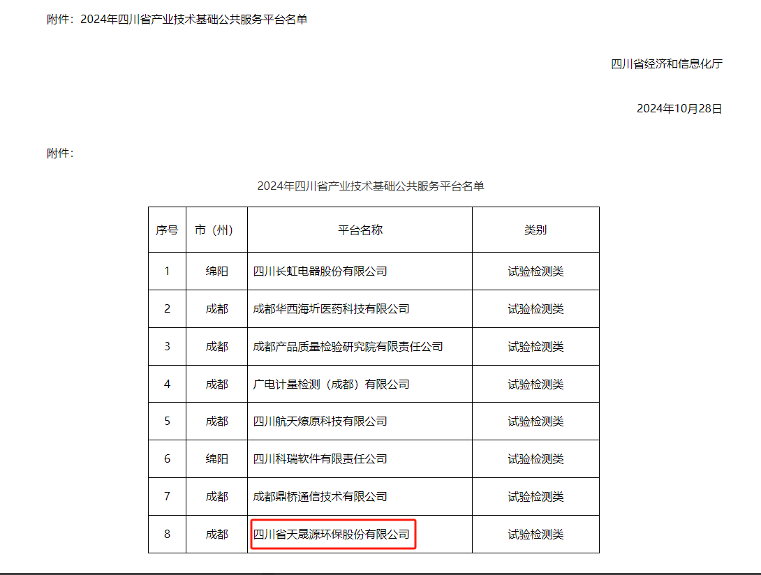 2024年四川省產(chǎn)業(yè)技術(shù)基礎(chǔ)公共服務(wù)平臺(tái)認(rèn)定工作四川省經(jīng)濟(jì)和信息化廳組織開(kāi)展,經(jīng)過(guò)單位自主申報(bào)、市(州)審核推薦、專家評(píng)審、現(xiàn)場(chǎng)核驗(yàn)、公示等一系列嚴(yán)格程序,最終8家企業(yè)通過(guò)認(rèn)定。截至目前,全省共有23單位被認(rèn)定為四川省產(chǎn)業(yè)技術(shù)基礎(chǔ)公共服務(wù)平臺(tái),天晟源環(huán)保是其中唯一一家以環(huán)保為主業(yè)的入選單位。