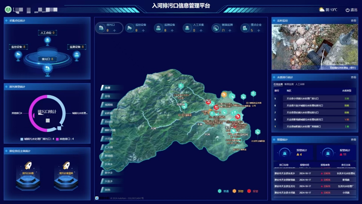 該項(xiàng)目一是摸清天全縣境內(nèi)河流入河排口信息,形成了入河排口清單和“污染源-入河排口-環(huán)境水體位置關(guān)系圖”,為深入推進(jìn)入河排口排查整治,實(shí)施精細(xì)化管理提供保障二是完善入河排口綜合管理機(jī)制根據(jù)“污染源—污水管網(wǎng)—排口—環(huán)境水體”位置關(guān)系,精確劃分入河排口管理范圍,明確鄉(xiāng)鎮(zhèn)責(zé)任主體,消除入河排口管理盲點(diǎn),便于發(fā)揮“綜合協(xié)調(diào)、定點(diǎn)幫扶、監(jiān)督檢查”的監(jiān)管職責(zé);三是提高了入河排口監(jiān)測監(jiān)控能力,通過入河排污口信息管理平臺(tái),實(shí)時(shí)監(jiān)控天全縣境內(nèi)入河排污口水質(zhì)自動(dòng)監(jiān)測數(shù)據(jù)、視頻監(jiān)控畫面,結(jié)合日常監(jiān)測與監(jiān)督性監(jiān)測數(shù)據(jù),提高識(shí)別與研判水質(zhì)變化趨勢(shì)的時(shí)效性與精準(zhǔn)性。